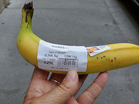 We stored our big bags at our hotel after checking out and made a stop at our neighbourhood grocer to start our day. I figured a banana was a healthy choice and would hold me over until I found coffee. This grocery store was self check out only. I took my banana to the computer but it was all in French. Unable to read it, I went into panic mode "abort, abort". A french man came to my rescue. He took my banana to another machine with a scale, pressed some buttons and a little sticker printed out indicating that my banana cost me .29€